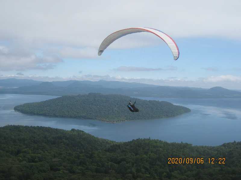 支笏湖バックに